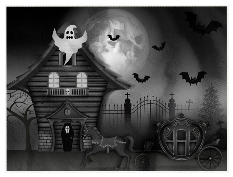 Com estampa em preto e branco, traz elementos clássicos do Halloween: casa mal-assombrada, carruagem, fantasmas, morcegos, lua cheia e portão de cemitério.