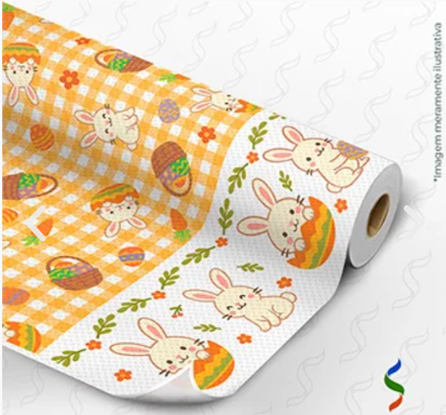Transforme sua decoração de Páscoa com este TNT estampado temático de coelhinhos, delicado e alegre. Com estampa exclusiva em tons suaves de laranja, branco e verde, ele é ideal para deixar festas, vitrines e ambientes ainda mais encantadores.